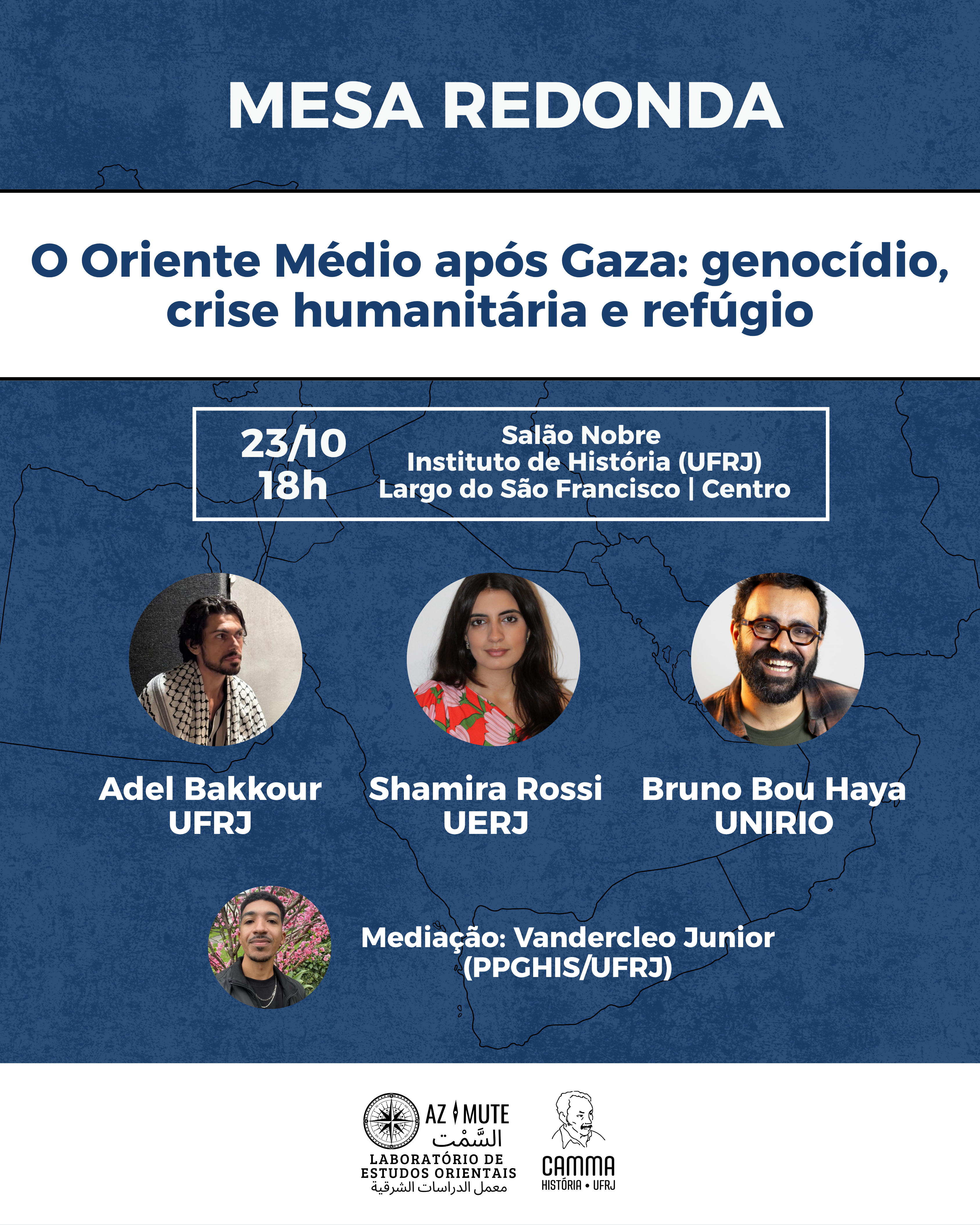 No dia 23 de outubro, às 18h, no Salão Nobre do Instituto de História da UFRJ, será realizada a mesa redonda presencial “O Oriente Médio após Gaza: genocídio, crise humanitária e refúgio”, onde estarão reunidos pesquisadores de diferentes áreas para discutir a atual configuração política e social da região do Oriente Médio após os 2 anos de genocídio em Gaza e seus impactos ao redor do mundo.